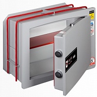 Надёжность сейфа обеспечивает массивная дверная панель из двух слоёв стали высокого качества, толщиной 10 мм, между которыми размещается защищённый от взлома и других видов силового воздействия замковый механизм, а также специальная ригельная система, гарантирующая крепкое запирание.